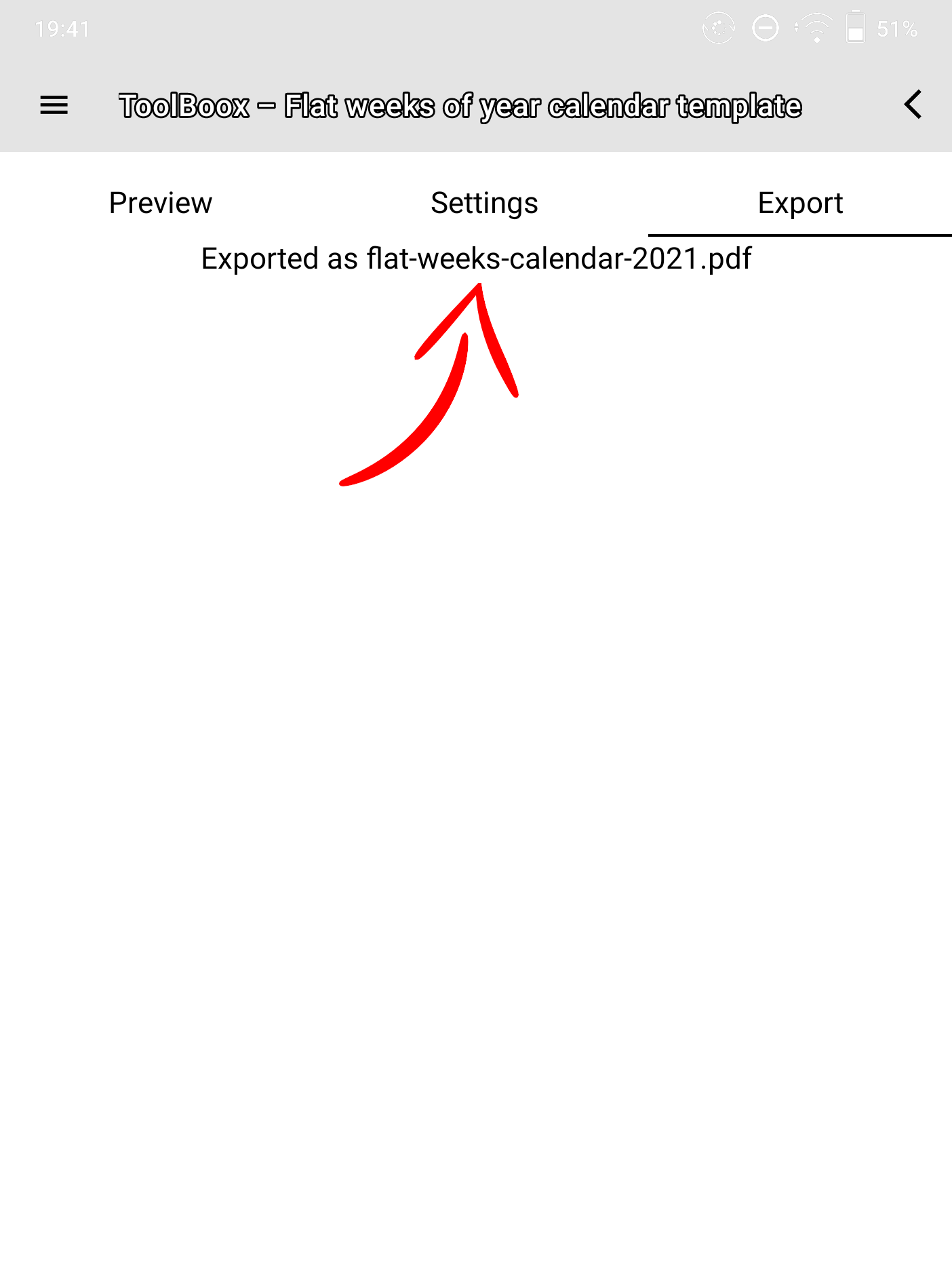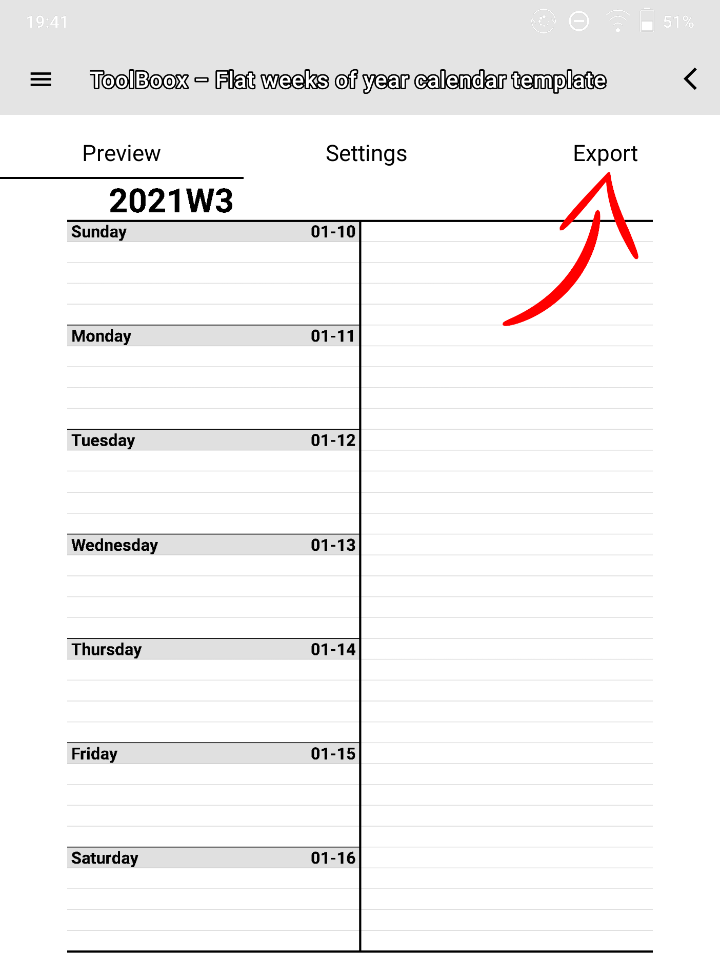 You can see the preview of the template page, you can apply some customization on the Settings tab, but now tap on the Export tab.